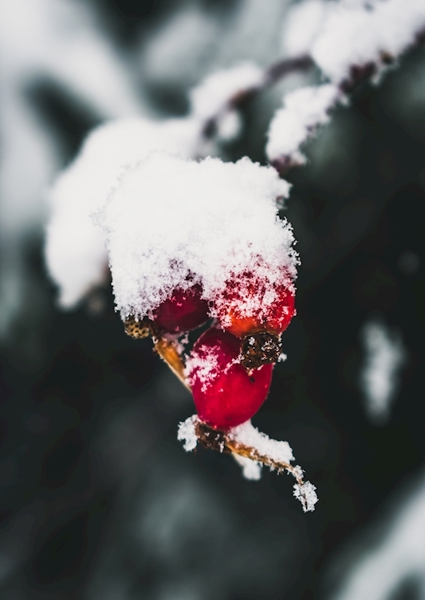 "The Wealth in Winter" poster by Sebastian Wieser. A striking winter photograph capturing the vibrant red of rosehip berries peeking through a soft blanket of snow. The contrast is stunning – those bold hues against the serene white, like nature's own festive decoration. Set in a tranquil Austrian forest, this piece evokes a cozy, holiday vibe, inviting viewers to embrace the beauty of winter's abundance. Perfect for adding a splash of color to any space, it’s a reminder that even in the cold, life thrives.