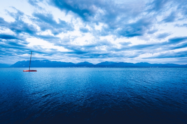 "Lac Léman" poster by Hamid Kashfi. A mesmerizing view of Lac Léman, where the deep blues of the water blend seamlessly with the dramatic sky. The calm surface reflects a world of tranquility, inviting you to lose yourself in its serene embrace. A lone sailboat adds a touch of adventure against the backdrop of the majestic Swiss mountains. This artwork captures the essence of nature's beauty—perfect for those who crave a slice of peaceful escape. Dive into the calm and let your imagination sail.