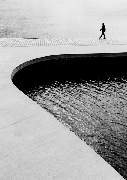 "Sunday walk" poster by Calle Artmark. A striking black-and-white capture from a Copenhagen promenade, this artwork features a solitary figure strolling along a sleek jetty. The smooth curves of the concrete contrast beautifully with the rippling water, creating a dynamic interplay of form and shadow. The silhouette evokes a sense of contemplation, inviting viewers to ponder the quiet moments of life. Perfect for those who appreciate minimalist aesthetics and urban landscapes, this piece brings a touch of modern elegance to any space.