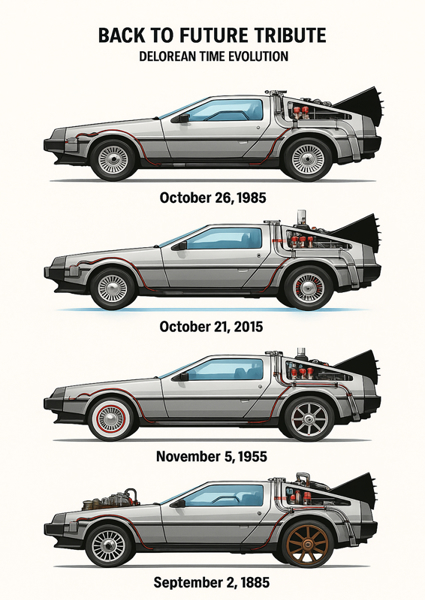 "back to the future Car " poster by Nicolas07. This artwork is a playful homage to the iconic DeLorean from "Back to the Future," showcasing its evolution through time. Each iteration captures a distinct era – from the classic 1985 model to its futuristic 2015 upgrade, and even the vintage 1955 design. The minimalist style highlights the car's sleek lines and unique features, making it a must-have for fans of sci-fi and nostalgia. Perfect for sparking conversations and igniting imaginations, this print is a tribute to timeless creativity and cinematic history.