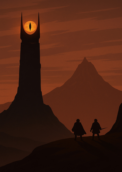 "Lord of the ring - Mordor" poster by Nicolas07. Step into a world where shadows loom and adventure beckons. This minimalist artwork captures the iconic tower of Mordor, its ominous eye glowing against a fiery backdrop. Two figures stand at the forefront, embodying the spirit of bravery and camaraderie. The stark contrasts and bold colors evoke a sense of urgency and intrigue, inviting viewers to explore the depths of their imagination. Perfect for fans of epic tales and cinematic journeys, this piece is a must-have for any art collection.