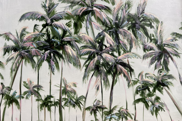 "This artwork features a lush grove of palm trees against a serene backdrop, capturing a tropical paradise. The impressionistic style and pastel hues evoke a calming, coastal vibe, perfect for beach house decor or tropical-inspired interiors."