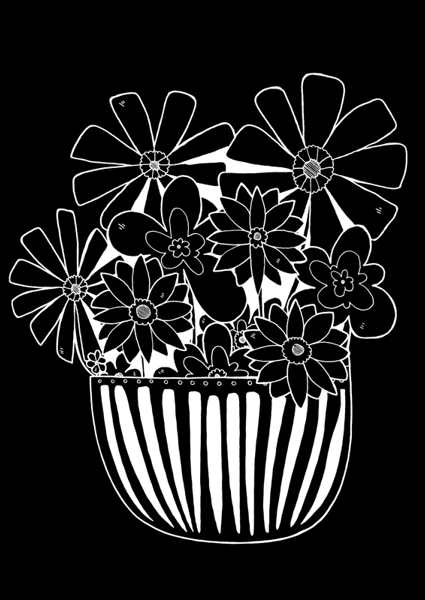"Black and white floral art featuring bold, graphic flowers in a striped pot against a dark background. This modern illustration highlights contrast and simplicity, perfect for contemporary decor and minimalistic design enthusiasts."