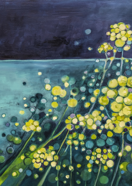 "This artwork features ethereal yellow flowers against a moody abstract background. Its vibrant use of color and contrast evokes a sense of movement and mystique, blending nature-inspired elements in a modern, expressive style."