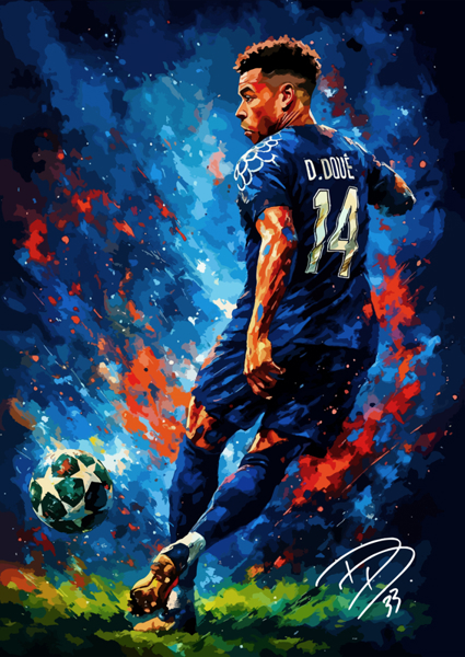"Desire Doue Paint Watercolor " poster by Balint Rag. This vibrant watercolor artwork captures the dynamic energy of soccer, showcasing a player in mid-action, ready to strike. The bold colors explode around him, creating a sense of movement and passion that resonates with sports enthusiasts. Perfect for any space, this piece not only decorates but inspires daily motivation. Available as a poster or framed fine art print, it’s a must-have for anyone looking to elevate their art collection with a touch of athletic flair.
