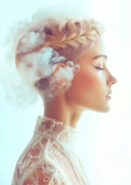 "Lost Dreams - Celeste" poster by Philippe HUGONNARD. Step into a dreamscape with this mesmerizing artwork. A mysterious woman, her face softly veiled in ethereal clouds, embodies a surreal elegance that captivates the senses. The delicate interplay of soft pastel tones and futuristic textures creates a hypnotic atmosphere, where identity blurs into abstraction. This piece invites viewers to explore the sensuality of femininity, making it a striking addition to any collection. Embrace the allure of Lost Dreams and let it transport you to a world of beauty and intrigue.