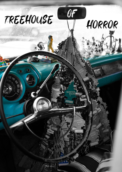"Treehouse of Horror" poster by VanFrame. This poster is a wild ride, like, seriously. It's all about the nostalgic atmosphere, right? You've got this retro car interior, all teal and dreamy, with a splash of black and white drama. The text "Treehouse of Horror" just hangs there and teases you with a hint of eerie fun. And those little figures? They are like little guardians of your drive into the unknown. So if you like quirky art that screams personality and a touch of the macabre, this poster is your ticket. Grab it and let your walls tell a story!