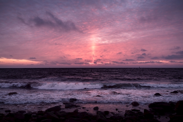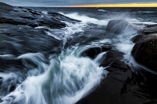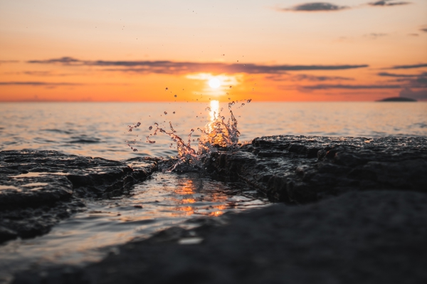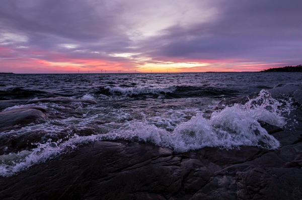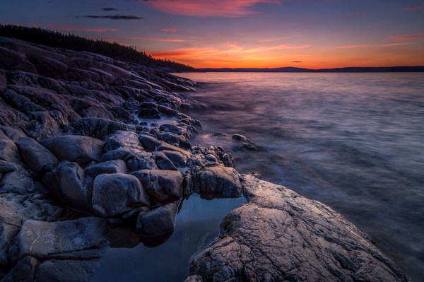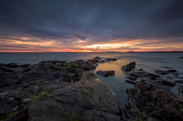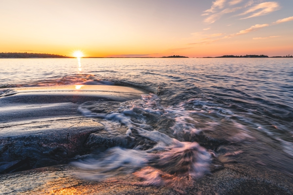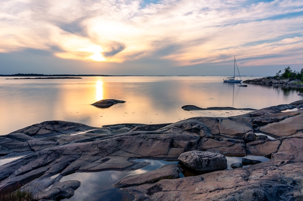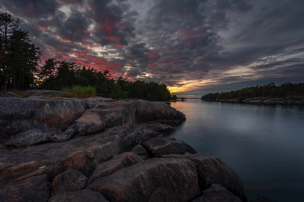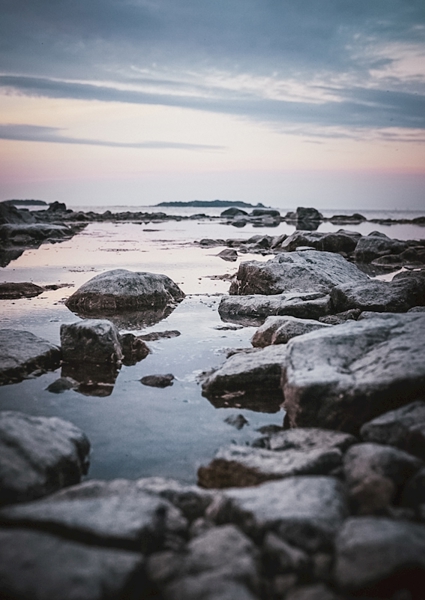 "Sunset in the archipelago" poster by Ann-Sofie Wirenborg. Experience the tranquil beauty of a sunset captured in the archipelago. This artwork showcases smooth, reflective waters cradling dark, jagged rocks, all bathed in soft hues of pink and orange. The serene atmosphere invites viewers to imagine the calm of Östhammar’s coastline, where time seems to stand still. Perfect for those who appreciate nature's quiet moments, this piece brings a slice of coastal magic into any space.