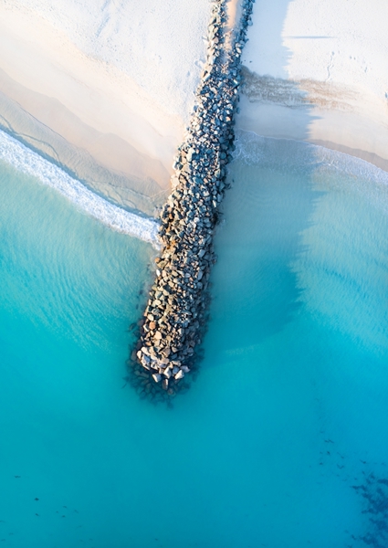 "Noosa bleu" poster by Florent Rols. Experience the serene beauty of Noosa with this stunning artwork. A mesmerizing blend of azure waters and soft sandy shores invites you to escape to a tropical paradise. The rocky jetty stretches into the crystal-clear ocean, creating a striking contrast against the vibrant blue hues. This piece captures the essence of a perfect holiday in Australia – where the beach meets the sea in a harmonious dance. Perfect for those who dream of sun-soaked days and tranquil moments by the water.