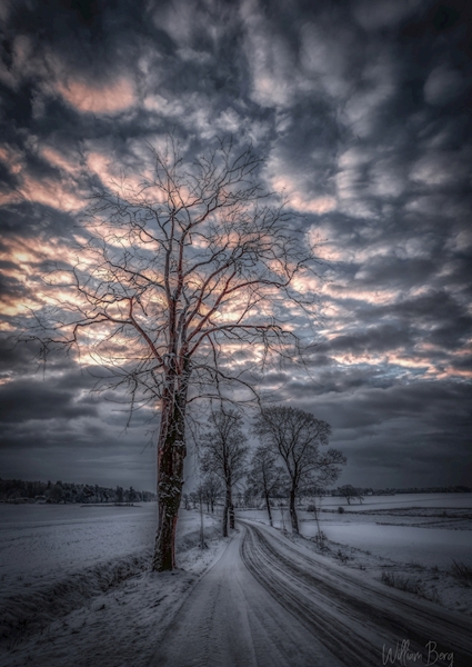 "Road to nowhere" poster by William Berg. A captivating winter scene unfolds on a winding road, leading into a misty unknown. The early morning light dances through dramatic clouds, casting a soft glow over the snow-covered landscape. Bare trees stand tall, their silhouettes stark against the vibrant hues of dawn. This artwork captures the serene yet eerie beauty of a Swedish winter, inviting viewers to lose themselves in the tranquil yet mysterious atmosphere. Perfect for those who appreciate the quiet elegance of nature's chill.