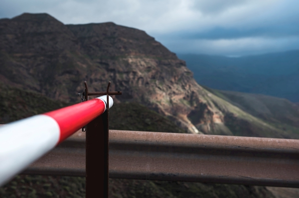 "Roadblock " poster by Natalie Lindholm. A striking moment captured in the mountains of Gran Canaria – a roadside barrier stands defiantly against a backdrop of rugged cliffs and moody skies. The bold red and white lines of the barrier contrast sharply with the earthy tones of the landscape, creating a visual tension that pulls you in. It’s a reminder of adventure halted, a pause in the journey. Perfect for those who appreciate the beauty of nature and the unexpected twists of travel.