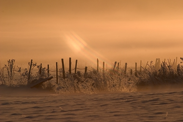 "Cold" poster by Mats Axell. A frozen landscape unfolds, where the air itself seems to crystallize at minus 20 degrees. Wisps of frost cling to a rustic fence, silhouetted against a warm, glowing horizon. The contrast is striking – the chill of winter meets the soft embrace of dawn. This artwork captures a moment where nature's extremes collide, evoking a sense of serene isolation. Perfect for those who appreciate the beauty in stark, cold environments, this piece invites viewers to experience the quiet magic of a frigid morning.