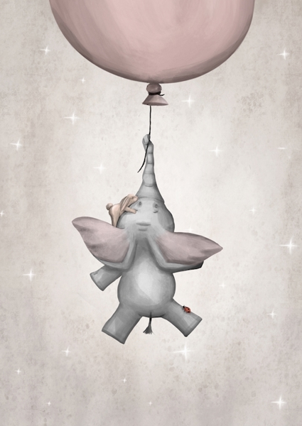 "Flying elephant" poster by Hanna Sandgren. A whimsical scene unfolds as a charming elephant takes flight, suspended by a soft pink balloon. This delightful artwork captures the essence of dreams and adventure, inviting little ones to imagine their own journeys. The pastel hues of pink and blue create a serene atmosphere, perfect for a nursery. With a cuddly toy rabbit by its side, this piece radiates warmth and comfort—ideal for lulling children into a peaceful slumber. A must-have for any child's room!
