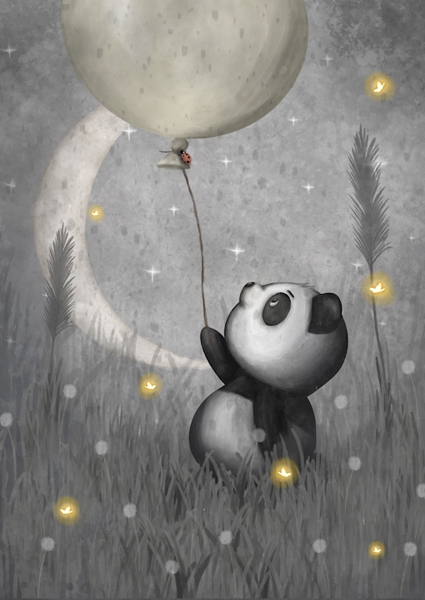 "Panda balloon" poster by Hanna Sandgren. A whimsical scene unfolds with an adorable panda clutching a balloon, gazing dreamily at a glowing moon. Set against a soft, muted backdrop, the artwork captures the essence of bedtime magic. Fireflies twinkle like tiny stars, adding a sprinkle of enchantment to the night. Perfect for a nursery, this charming piece invites sweet dreams and bedtime stories, making it an ideal addition to any child's room. Let this panda inspire imagination and wonder!