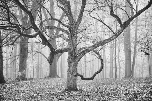 "Land Art" poster by Peter Bodenstein. A striking black-and-white capture of winter trees, where nature flexes its artistic muscles. The gnarled branches twist and turn, creating a dance of shadows against a misty backdrop. It’s like the trees are whispering secrets, inviting you to explore their stories. The fog adds a layer of mystery, making this piece feel both timeless and contemporary. Perfect for those who appreciate the raw beauty of nature—it's a conversation starter, a mood setter, and a piece of art that resonates.
