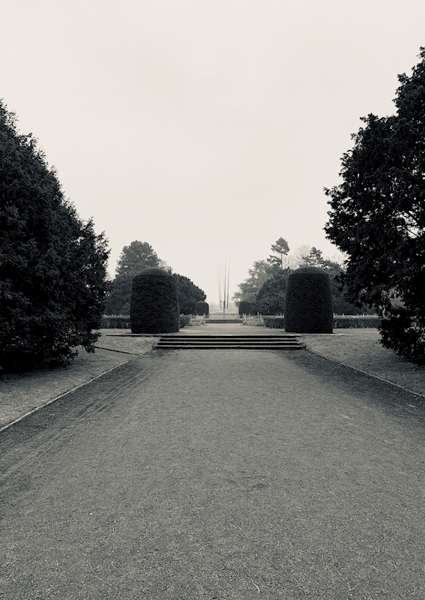 "Symmetry " poster by Andrea Sprick. A striking black-and-white photograph capturing the serene symmetry of Düsseldorf's Nordpark in winter. The composition draws the eye down a meticulously arranged pathway, flanked by sculpted hedges that create a sense of order and tranquility. The foggy atmosphere adds a layer of mystery, inviting contemplation. Nature, tamed yet wild, speaks volumes in this quiet moment. Perfect for those who appreciate the beauty of structured landscapes and the subtle elegance of monochrome art.