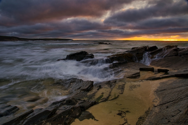 "Outer hebrides" poster by Wolfgang Jesch. Experience the breathtaking beauty of a Scottish sunset captured at the Outer Hebrides. Waves crash against rugged rocks, creating a dynamic interplay of water and stone. The sky, a canvas of moody clouds, hints at the day's end, while the horizon glows with warm, fading light. This artwork embodies nature's raw power and tranquility, inviting viewers to lose themselves in its serene coastal charm. Perfect for those who appreciate the wild beauty of the ocean.