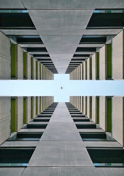 "Flight tracker" poster by Roc Isern. A striking overhead view of Barcelona's urban landscape, this artwork captures the essence of modern architecture. The sharp lines of concrete and vibrant green accents create a dynamic contrast, drawing the eye upward. A lone plane cuts through the sky, adding a sense of movement and freedom. It's like a snapshot of city life, where the mundane meets the extraordinary. Perfect for those who appreciate design and urban vibes – a must-have for any contemporary art lover.