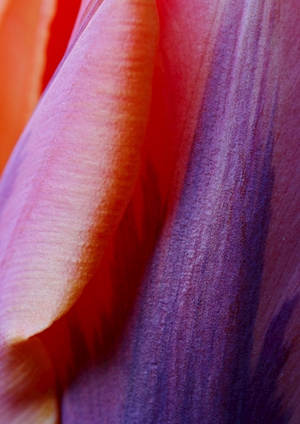 "Prinses Irene Tulip #2" poster by Wilko van Oostrum. A vibrant close-up of a Prinses Irene tulip reveals a stunning interplay of soft pastel hues—think peachy pinks melting into deep purples. The delicate textures of the petals create a visual feast, almost like a painter's brushstrokes on canvas. This minimalist composition stands out as a chic poster, perfect for adding a splash of nature's elegance to any interior. It's not just a flower; it's a statement piece that draws the eye and sparks conversation.