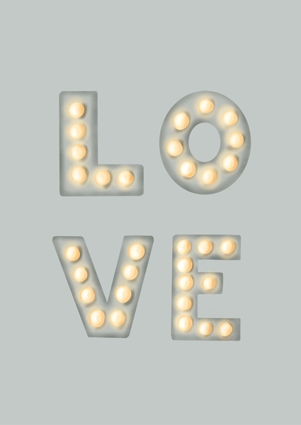"LOVE - light letters SAGE" poster by Aminah Eleonora. A playful take on affection, this artwork spells out "LOVE" in charming light letters. Perfect for brightening up a kids' room, it radiates warmth and joy. The soft blue-green hue adds a modern twist, making it a delightful focal point. Each letter, inspired by classic marquee lights, invites a cozy, loving vibe. Ideal for sparking imagination and creating a nurturing atmosphere, this piece is a must-have for any child’s space.