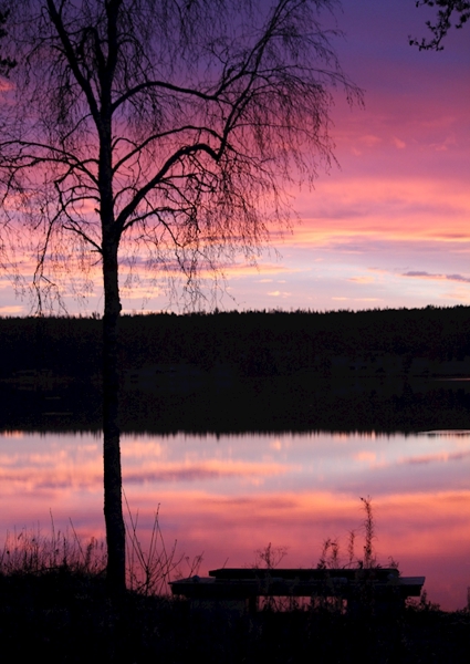 "Purple morning by the lakeside" poster by Åsa Eklund. A stunning lakeside scene unfolds as the sunrise paints the sky in vibrant purples and soft pinks. Silhouetted against this breathtaking backdrop, a lone tree stands tall, reflecting the tranquil beauty of the water below. The serene atmosphere invites contemplation, making it the perfect addition to any space that craves a touch of nature's magic. Ideal for those who appreciate the quiet moments that life offers – a visual reminder to pause and soak in the beauty around us.