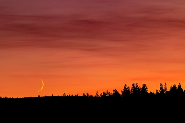"A very subtle crescent Moon hovers above the dark horizon, just enough to be visible in between the clouds of a fiery sunset."