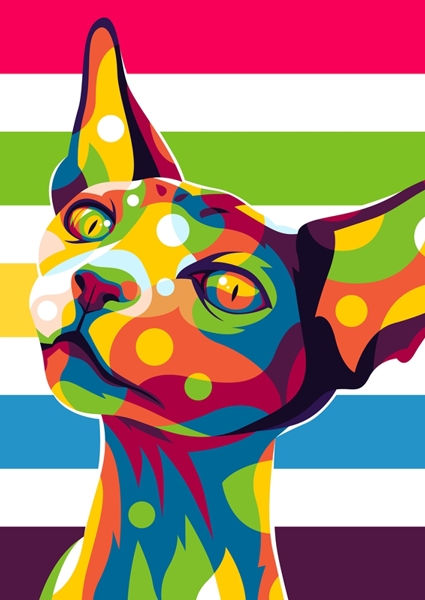 "The Sfinks Cat in Pop Art made with curved shapes and a combination of many colors to form a cute, elegant, cool and of course colorful Sfinks Cat object."