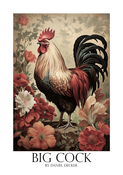 "Polla grande" poster de Decker Studios. Un gallo que no pasa desapercibido, con plumaje vibrante y detalles que parecen cobrar vida. Se planta en medio de un jardín floral que casi compite con su presencia, un contraste perfecto entre naturaleza y actitud. Este gallo no solo canta, se luce con una mezcla de elegancia y descaro que invita a mirarlo de cerca. Ideal para quienes disfrutan del arte moderno con un toque pícaro y contemporáneo. Oye, ¿quién dijo que un gallo no puede ser una estrella?