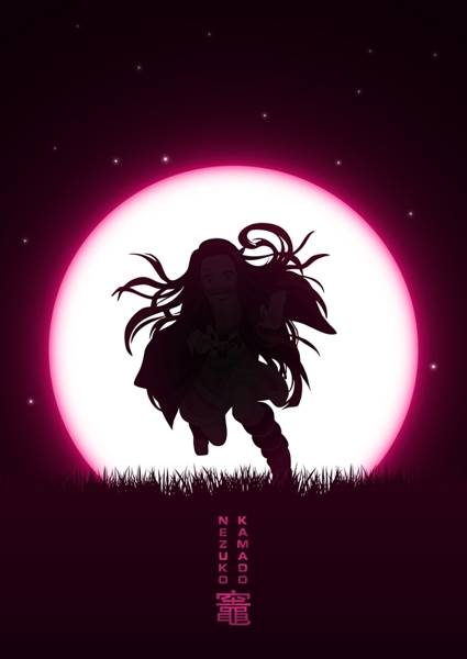 "Luna de Nezuko" poster de Faissal Thomas. Una silueta en plena acción se recorta contra una luna rosa vibrante que parece brillar con vida propia. Nezuko Kamado cobra protagonismo en esta pieza que mezcla la energía del anime con un toque etéreo y nocturno. La hierba baja añade un detalle sutil, casi susurrante, mientras estrellas diminutas salpican el fondo oscuro. Es un guiño visual irresistible para amantes del manga y la cultura pop japonesa. Pero oye… ¿quién no querría este momento congelado en su pared?