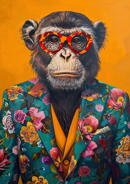 "A playful yet elegant chimpanzee dressed in a vibrant floral suit with striking orange glasses. This artwork blends charm and boldness, perfect for modern decor."