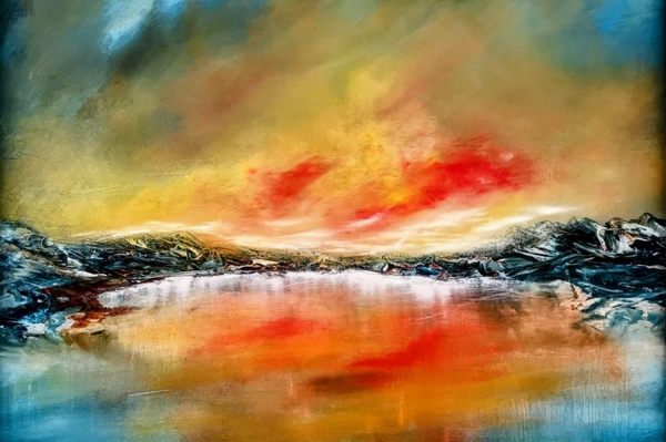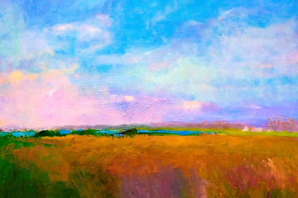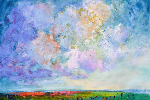 "This impressionistic landscape captures the serene beauty of vibrant skies meeting lush fields, conveying tranquility and hope. Perfect for modern or rustic interiors, its textured layers add depth and warmth, making it an ideal centerpiece for living rooms or cozy reading nooks."