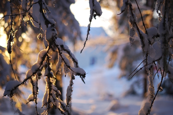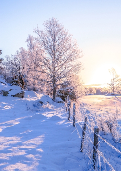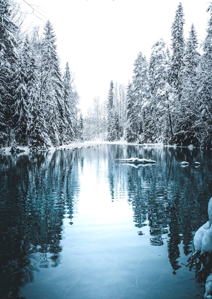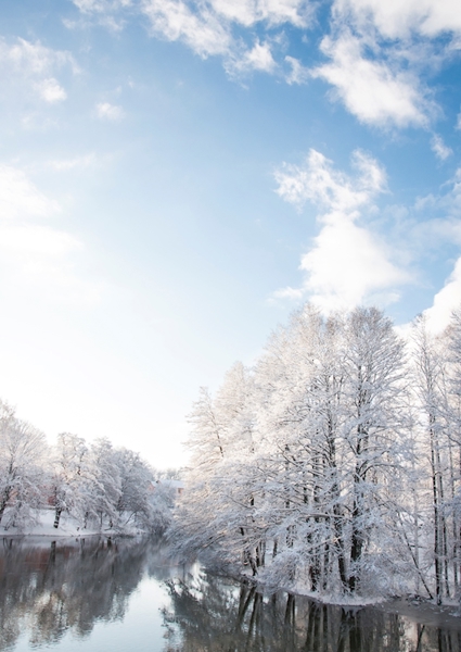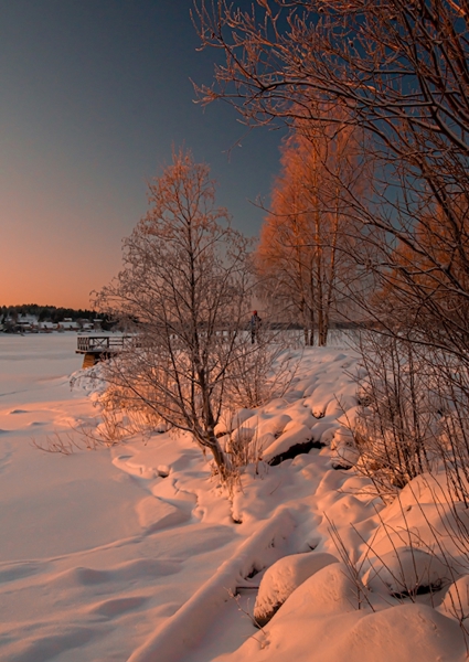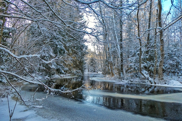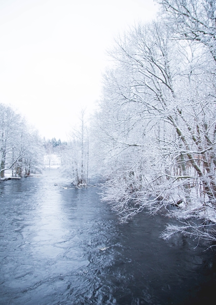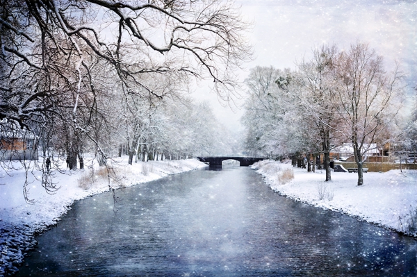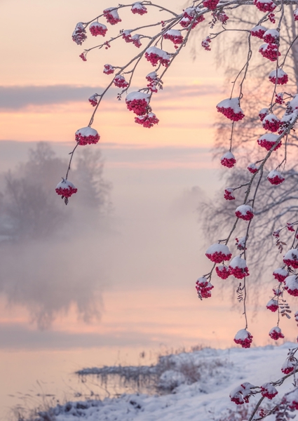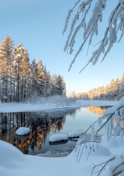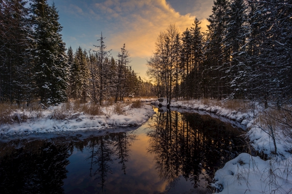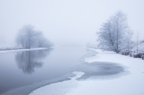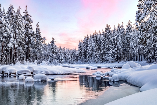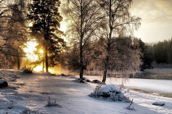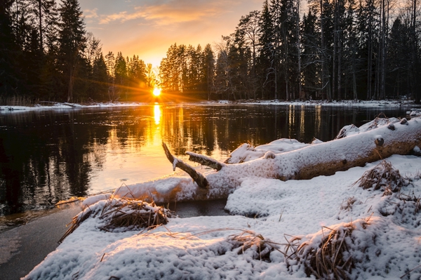 "Sunrise at snow covered river."