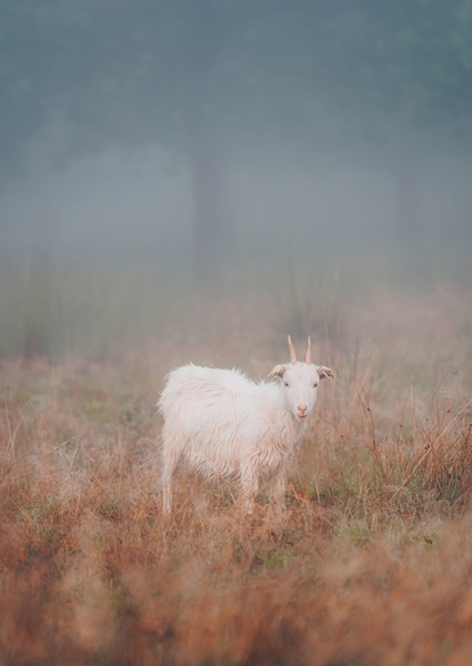 "Curiosidad por el mundo" poster de Henrik Nygren. Un cordero curioso aparece entre la niebla etérea de Skåne, con su pelaje esponjoso casi fundiéndose en esa atmósfera de otoño denso y melancólico. La neblina abraza el paisaje, creando un momento suspendido, como si el tiempo se hubiera olvidado de avanzar. Esa mezcla de naturaleza y misterio invita a perderse en la calma rural, con un toque de magia que parece salido de un sueño nórdico. Pero oye, ¿quién dijo que la vida en el campo no puede ser encantadora y un poco enigmática?