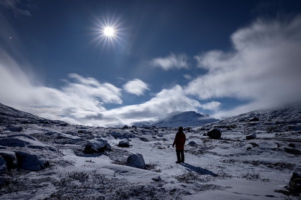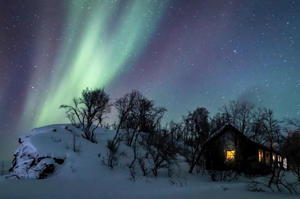 "The sleeping forest, during its long hibernation, while the northern lights dance magically above its trees."