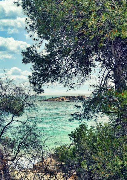 "Cala Comtessa II, Mallorca" poster tekijältä Fabian Kimmel. Vesi näyttää kutsuvalta, vaikka siinä on jotain raikasta ja vähän villiä – ei mikään tylsä turkoosi, vaan sellainen elävä, luonnollinen sävy. Puut kehystävät näkymän kuin salainen ikkuna Mallorcan rannalle, jossa meri ja taivas kohtaavat. Se fiilis, kun haluat hypätä suoraan tuohon maisemaan ja unohtaa kaiken muun. Sopii niille, jotka kaipaavat pienen palan paratiisia kotiin, ilman turhia kikkailuja. Tämä teos toimii kuin pikku pakopaikka arjen keskellä.