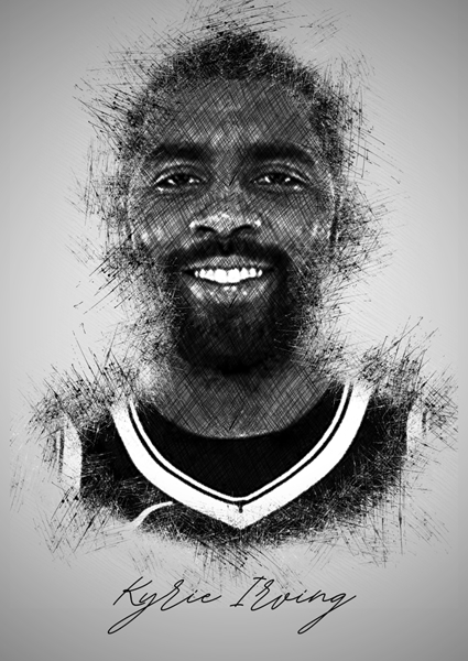 "Kyrie Irving" poster de Sketch Art. Une explosion de traits nerveux qui capte l’essence même de Kyrie Irving – son sourire contagieux, cette énergie qui pulse à travers le jeu. On dirait un croquis sorti d’un carnet de notes, où chaque ligne danse et vibre autour de son visage, presque comme une aura. Pas juste un portrait, mais une vibe – entre art brut et street culture, le tout en noir et blanc. Idéal pour ceux qui veulent sentir le basket autrement, un brin plus artistique, un poil rebelle.