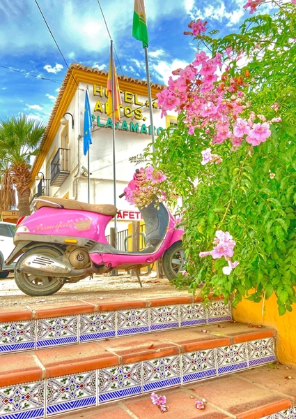 "In the small Spanish village Maro, this charming pink Vespa was parked next to an equally pink flower"