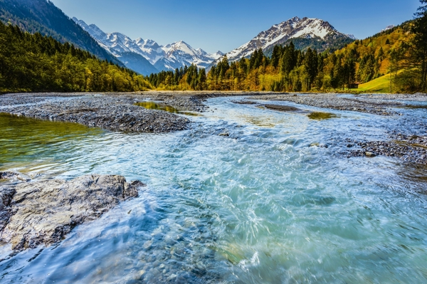 "Crystal clear water in the Stillach in the Stillach Valley in the Allgäu Alps on a beautiful spring day"