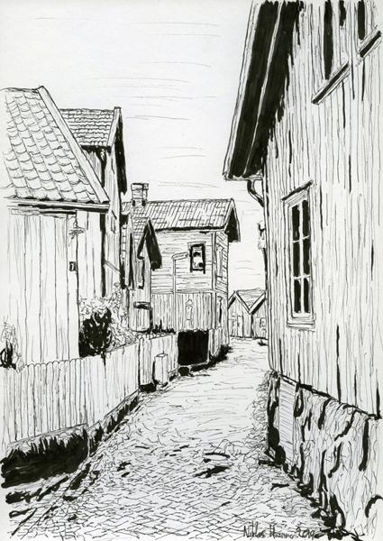 "Village de pêcheurs Lysekil" poster de Niklas Hammar. Un passage étroit, pavé, bordé de maisons en bois aux toits de tuiles, typique d’un village de pêcheurs suédois. Chaque trait rappelle la texture rugueuse des planches et la douceur du temps qui suspend l’instant. On devine l’histoire dans ces façades qui semblent chuchoter des récits d’autrefois. Un voyage visuel dans Lysekil, où simplicité rime avec authenticité – et où le silence des rues en dit long. Parfait pour les amateurs d’ambiance nordique et de charme rustique.