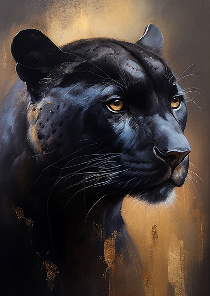 "Denna fantastiska målning visar en kraftfull svart panterporträtt mot en bakgrund av rika gyllene nyanser. Panterns släta och muskulösa kropp är fångad i otrolig detalj, med dess genomträngande ögon och fientliga uttryck som fångar djurets vilda och ociviliserade ande. De gyllene färgerna lägger till en känsla av elegans och lyx till verket, vilket gör det till ett verkligt slående och attraktivt konstverk. Oavsett om du är en beundrare av stora katter eller helt enkelt uppskattar slående och unika konstverk, kommer denna svarta panterporträtt vara en statement-del i vilket rum som helst."