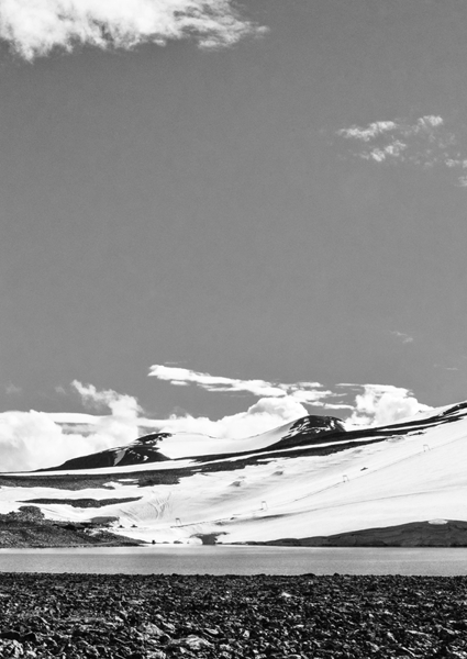 "Snow covered Norweigan mountains in Summer. Breathtaking landscape in b/w."