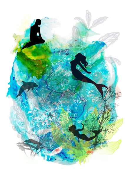 "La Petite Sirène" poster de Marie Langkilde. Un tourbillon de bleus et de verts hypnotise l’œil, comme une plongée instantanée dans un rêve aquatique. Trois silhouettes de sirènes dansent en silhouettes noires, mystérieuses et libres, entre bulles et algues translucides. L’encre alcoolique donne cette fluidité folle, presque hypnotique. Un univers enfantin, à la fois doux et un brin sauvage – le genre de tableau qui transforme n’importe quelle pièce en aventure sous-marine, sans quitter le salon.