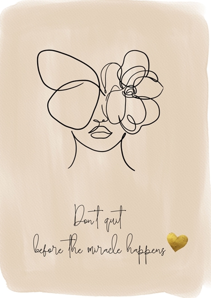 "N’abandonnez pas avant le miracle " poster de ArtDesign by KBK. Un trait unique qui dessine une femme entre fleur et papillon – fragile, presque suspendue dans le temps. Le minimalisme se fait puissant, comme un murmure qui s’impose : « Ne lâche rien avant le miracle ». Cette touche dorée, discrète mais efficace, claque comme un clin d’œil. Parfait pour ceux qui aiment que leur déco parle d’espoir et de beauté intérieure, sans faire de bruit. Un vrai mantra à accrocher.