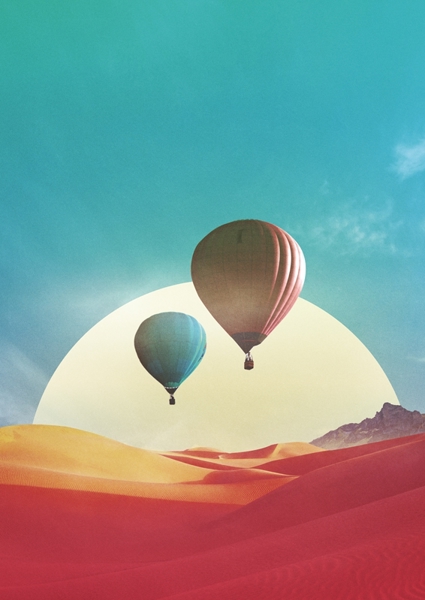 "Stéréolab" poster de Fran Rodríguez. Deux montgolfières flottent au-dessus de dunes rouges vibrantes, sous un ciel turquoise éclatant. Le soleil, immense et blanc, joue les vedettes en arrière-plan, ajoutant une touche presque surnaturelle à cette scène onirique. Un mélange subtile de vintage et de psychédélisme qui fait voyager sans bouger. Parfait pour ceux qui aiment l’aventure avec un petit twist rétro-futuriste. Un vrai trip visuel, mais doux, presque romantique.