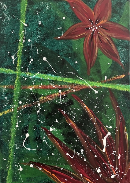 "Sommarlängtan" poster de Sofie Heinsvig. Un feu d’artifice de verts profonds et de rouges audacieux, comme un jardin secret où l’été s’invite en mode vibrant. Les fleurs s’étirent, presque carnivores, tandis que des éclats blancs virevoltent façon confettis d’une fête improvisée. Ce tableau, c’est un shoot d’énergie naturelle, un rappel que même en hiver, on peut sentir la chaleur du soleil sur la peau. Parfait pour secouer les murs un peu trop sages.