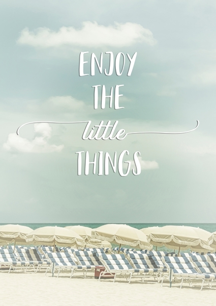 "Profitez des petites choses" poster de Melanie Viola. Une plage calme à Miami Beach, où les chaises longues rayées bleu et blanc s’alignent sous des parasols crème, comme une invitation à faire une pause. Le ciel pastel et les nuages légers cadrent parfaitement le message « ENJOY THE little THINGS », un rappel discret et cool de savourer l’instant. Vintage et chill, c’est le mood parfait pour se téléporter direct en mode vacances sans bouger. Juste ça.