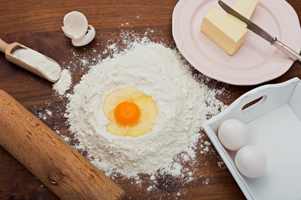 "Ingredients for baking....egg, flour, sugar, butter, rolling pin..."