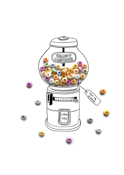 "Hand-illustrated candy vending machine in the typical golden Freckles style: first the small, colorful candies were placed on a piece of white paper, then the idea came up. I drew it all and then photographed it afterwards. One of my favorite pictures - fits everywhere and is for everyone"