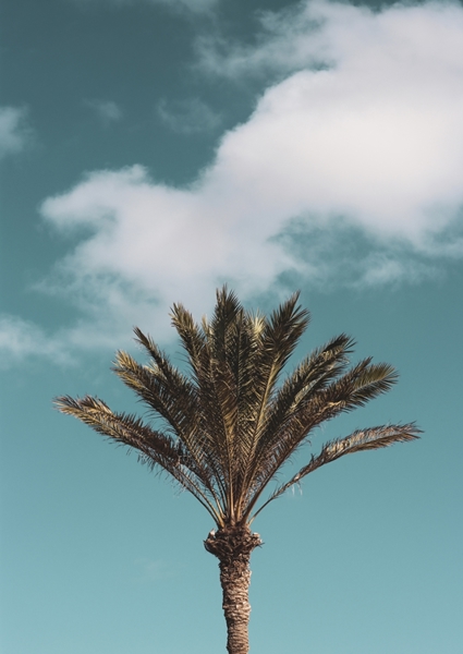 "Le palmier" poster de Renate Wasinger. Un palmier solitaire s’élance vers un ciel d’un bleu profond, ponctué de nuages légers comme un souffle. Minimaliste et pourtant plein de caractère, ce visuel distille une ambiance vacances à l’état pur – soleil doux, air chaud, et cette promesse de farniente. Idéal pour insuffler une touche nature et cool dans une cuisine, une chambre ou une salle de bains. L’évasion s’invite chez vous, sans chichi.
