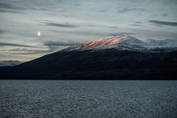 " One late afternoon on a beach at Torneträsk, the moon rose behind the mountains and the sun lit up the mountain tops."